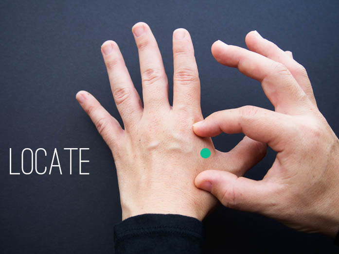 1. Locate: Large Intestine 4 is located in the middle of the second metacarpal bone, that little bone in your hand, below your index finger, on the thumb side.