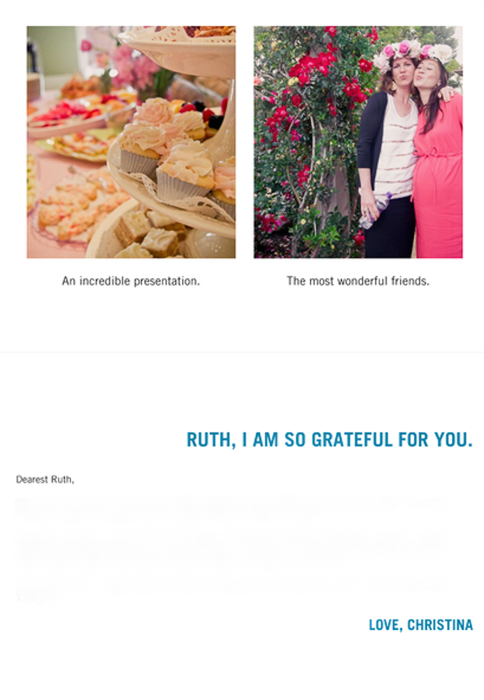 Aside from thank you gifts, I was looking for really personal thank you messages for the hostesses of my baby shower, Ruth and Kelly, Ruth’s personal chef, Andrew and my sister Tracey. You know how I feel about thank you cards.